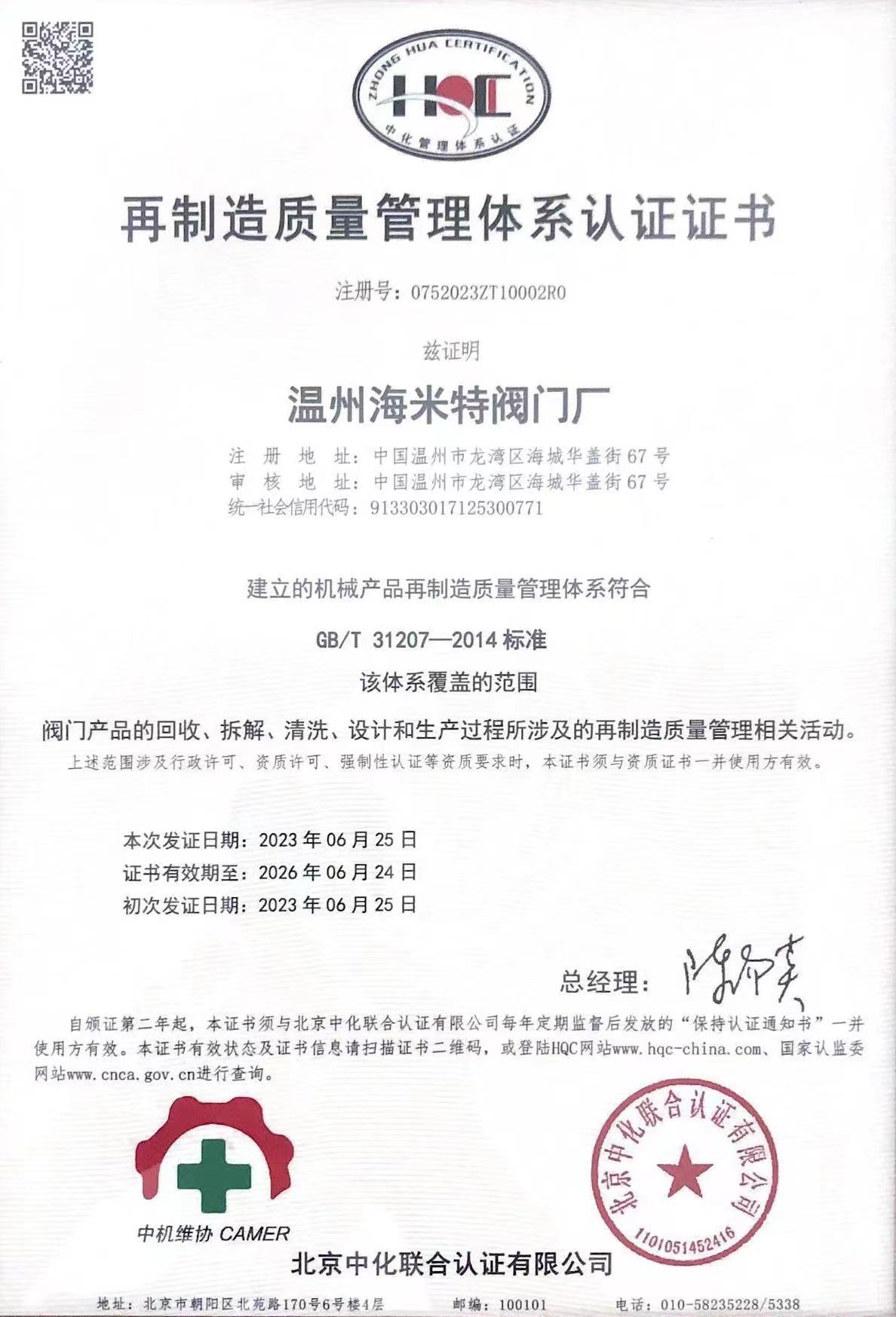 • 再制造质量管理体系认证证书