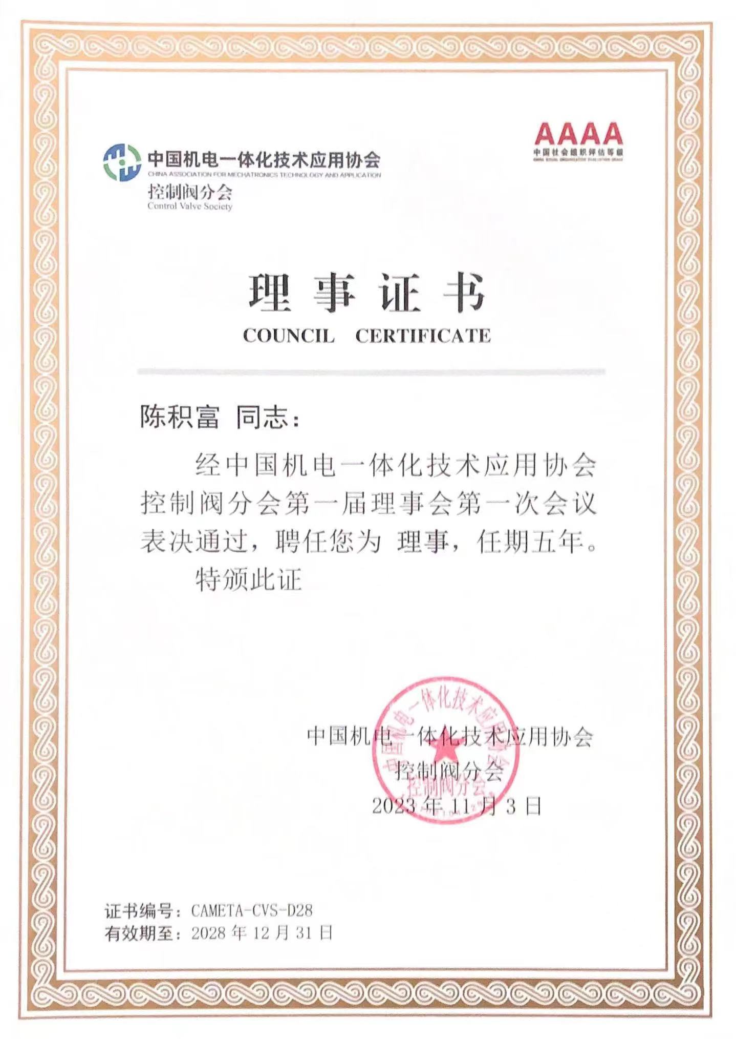 • 理事证书